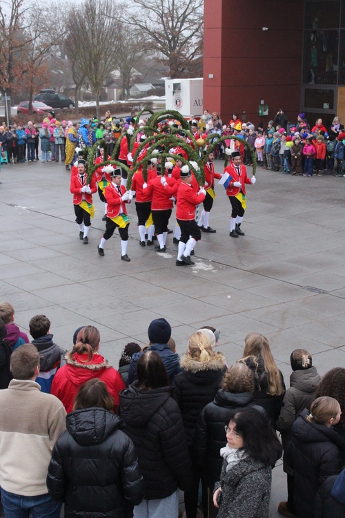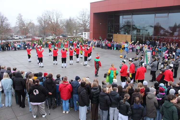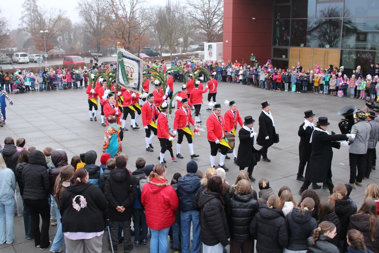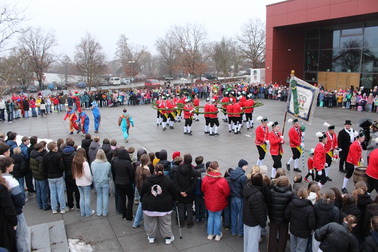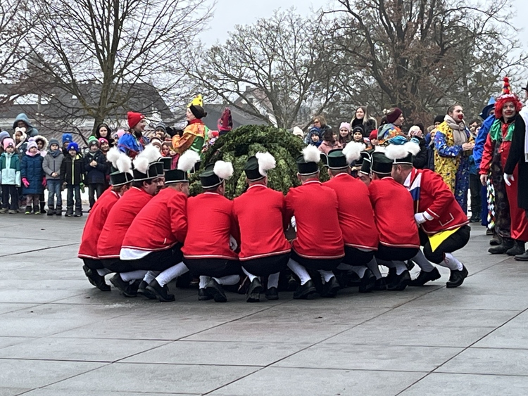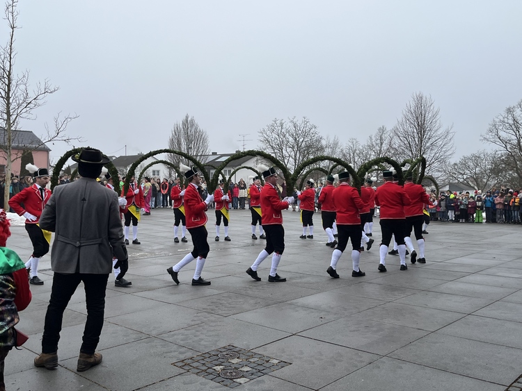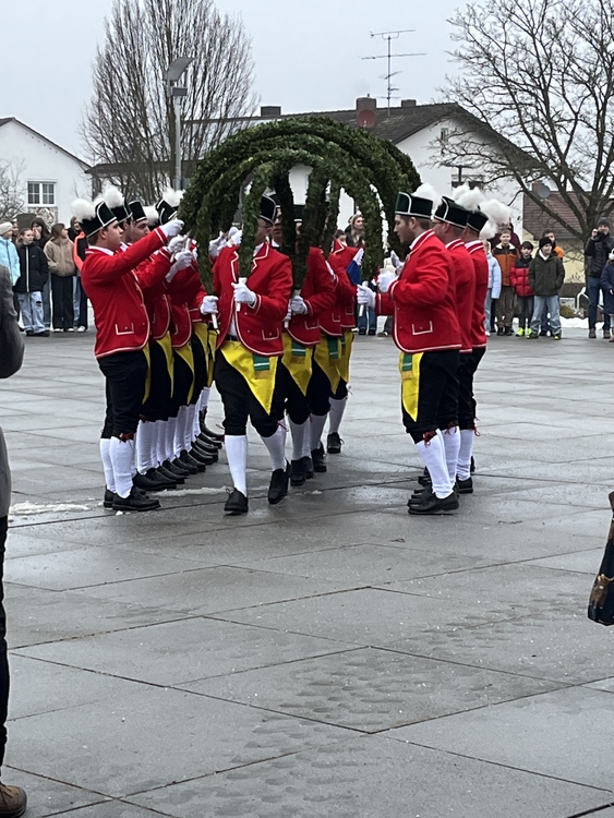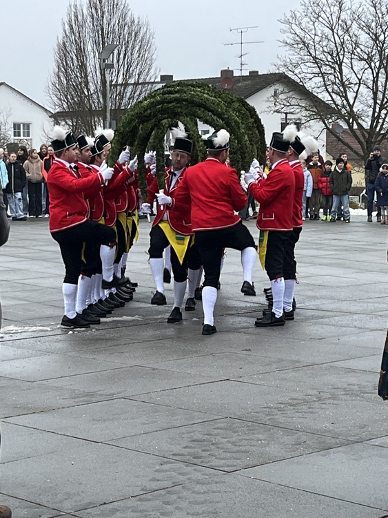 Heute waren die Schäffler aus Osseltshausen vor der Hopfenlandhalle aktiv und zeigten ihren traditionellen Tanz für die Grundschule Au und die Abenstal Realschule.