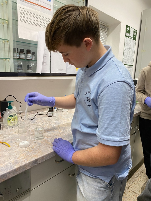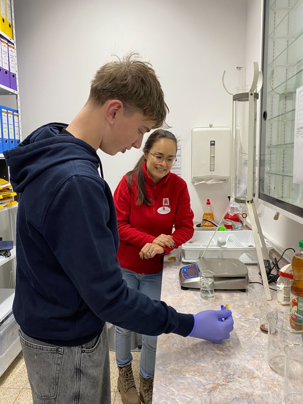 Darüber hinaus durften wir einen Blick ins Labor werfen. Dort konnten wir zunächst verschiedene Versuche, wie z. B. eine Fällungsreaktion durchführen und uns wurden verschiedene Geräte vorgestellt. Auch mischten wir unsere eigene Salbe mit einem Duft nach Wahl an.