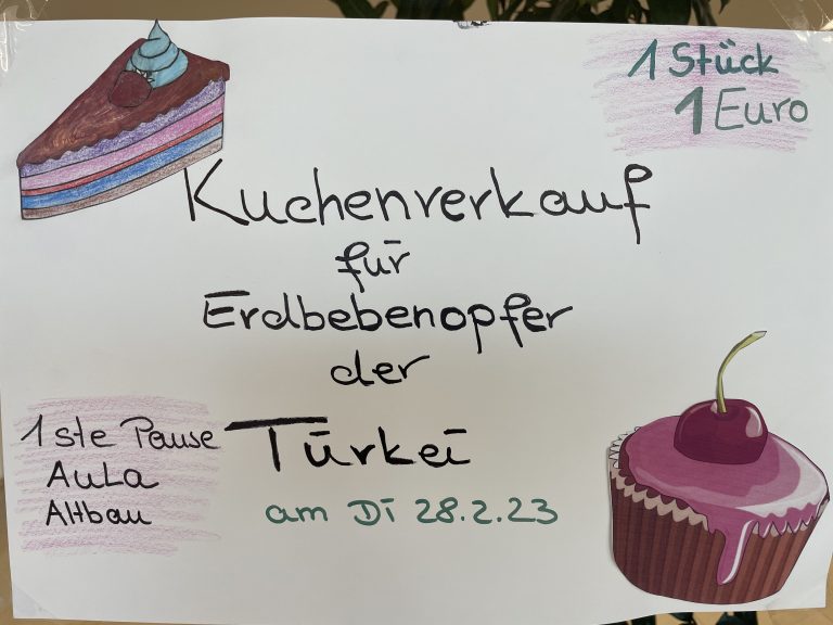 Für die Erdbebenopfer in der Türkei und Syrien hat die 8a in Eigeninitiative einen bunten Kuchenverkauf organisiert. Die eingenommenen Spenden von rund 400 Euro kommen der Aktion Deutschland hilft zugute.