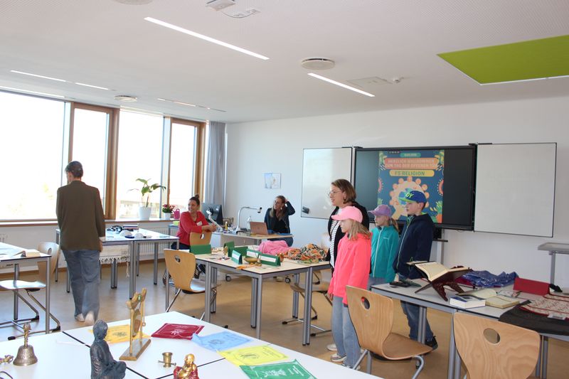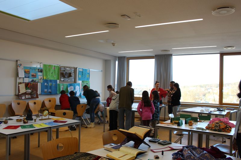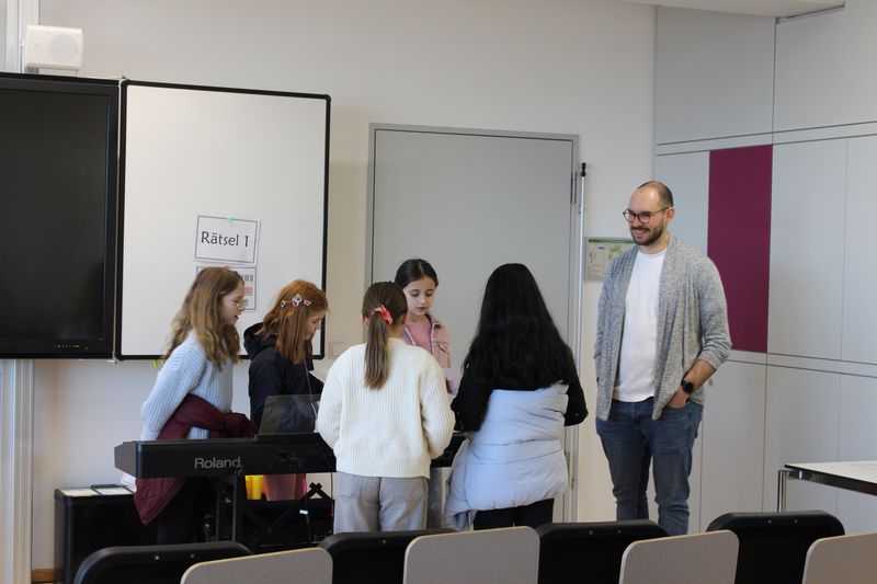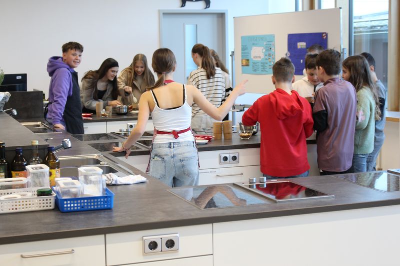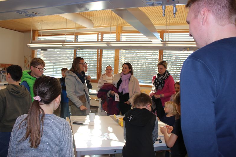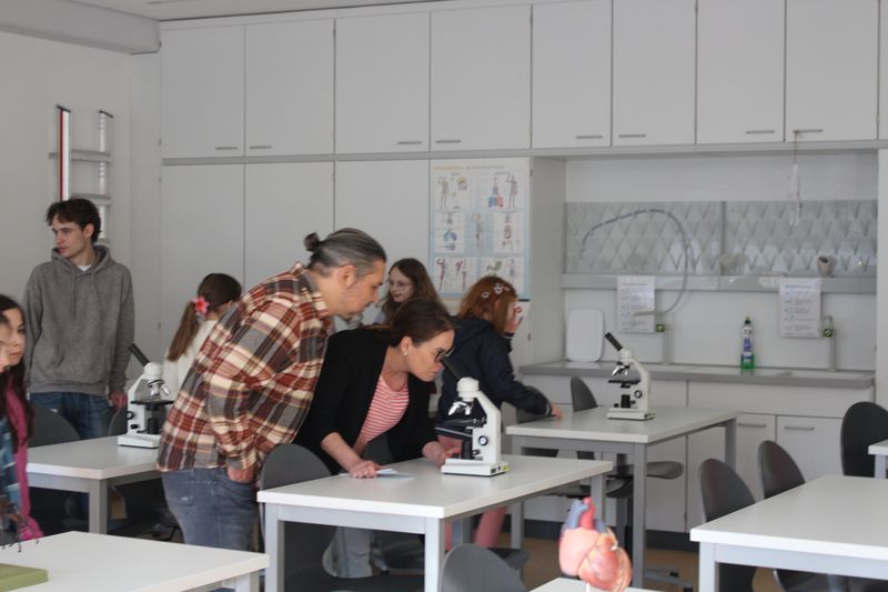 Im Anschluss machten wir uns auf den Weg durch die verschiedenen Klassenzimmer und Fachräume, um die vielfältigen Angebote der Schule zu erkunden. Die Fachschaften präsentierten sich mit großem Engagement: Von der Ausstellung der Talentgruppe Werken über Einblicke in die Schulküche bis hin zum Mikroskopieren in der Biologie war für jeden etwas dabei.