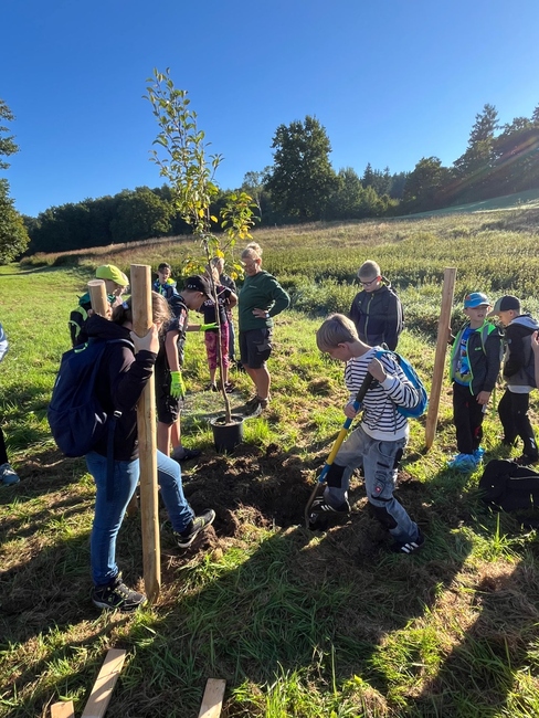 Die fünften Klassen verbrachten ihren Wandertag auch in diesem Jahr an der schuleigenen Obstplantage, auf der nun bereits zum vierten Mal in Folge Bäume von den neuen Fünftklässlern gepflanzt wurden. Jede Klasse setzte dabei ihren eigenen Baum: die 5a einen Apfelbaum, die 5b einen Birnenbaum und die 5c einen Zwetschgenbaum. Begleitet wurde die Aktion von Herrn und Frau Haubrichs von Gala Bau Haubrichs.